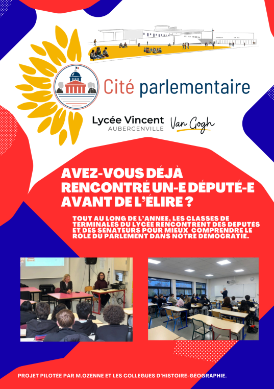 Le projet « Cité Parlementaire », piloté par M. Ozenne et l’équipe d’Histoire-Géographie, est une initiative citoyenne et éducative majeure du Lycée Vincent Van Gogh d’Aubergenville. Ce dispositif vise à former les jeunes à la démocratie représentative et à leur faire comprendre le fonctionnement concret du Parlement (Assemblée nationale et Sénat).